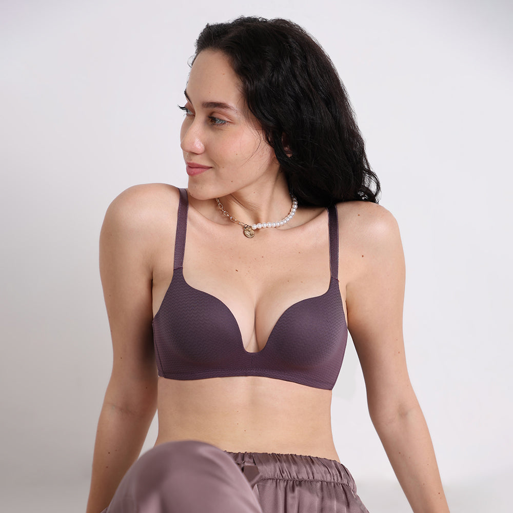 - Padded, non-wired, plunge push-up bra